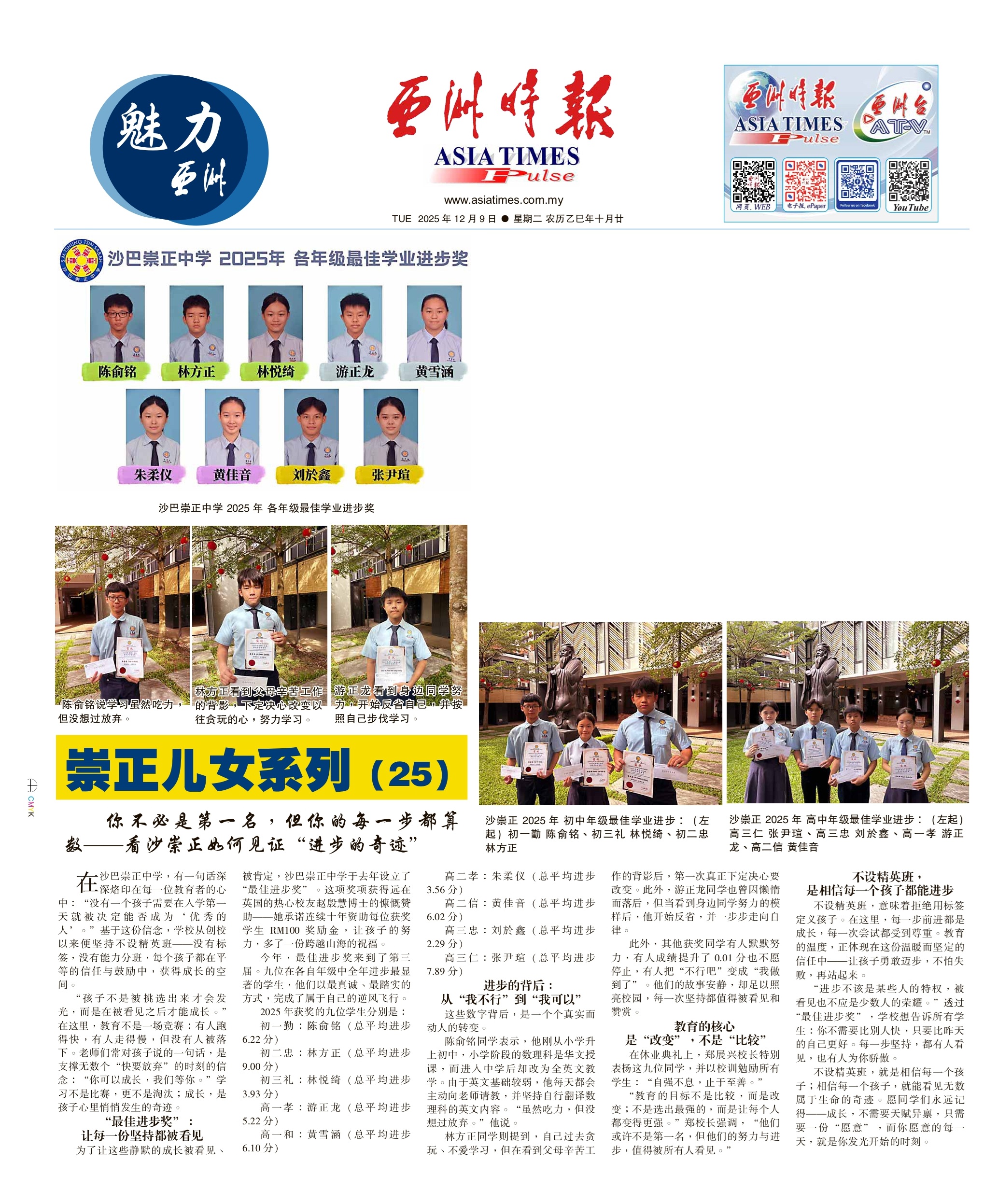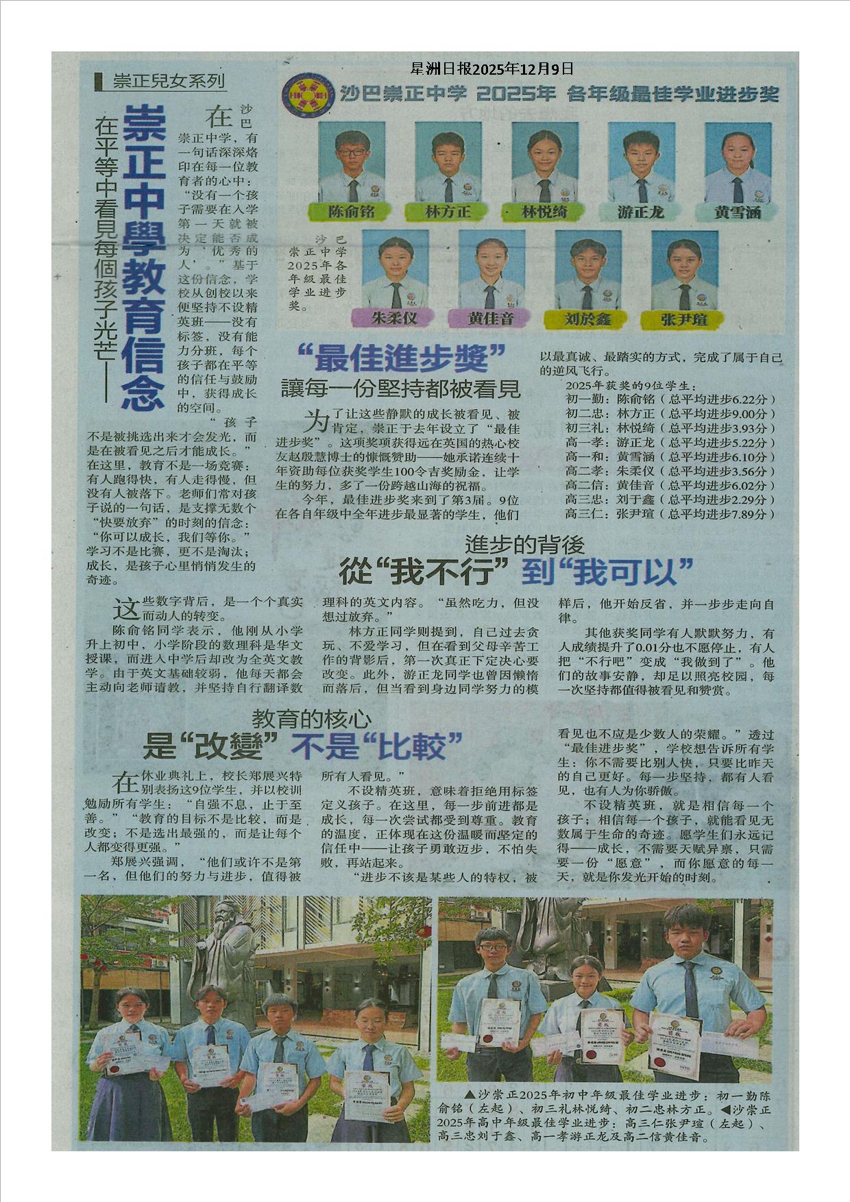 在沙巴崇正中学,有一句话深深烙印在每一位教育者的心中:“没有一个孩子需要在入学第一天就被决定能否成为‘优秀的人’。”基于这份信念,学校从创校以来便坚持不设精英班——没有标签,没有能力分班,每个孩子都在平等的信任与鼓励中,获得成长的空间。