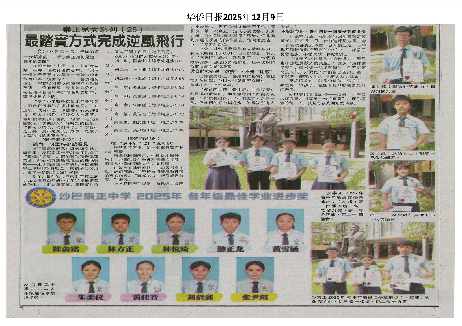 为了让这些静默的成长被看见、被肯定,沙巴崇正中学于2023年设立了“最佳进步奖”。这项奖项获得远在英国的热心校友赵殷慧博士的慷慨赞助——她承诺连续十年资助每位获奖学生 RM100 奖励金,让孩子的努力,多了一份跨越山海的祝福。