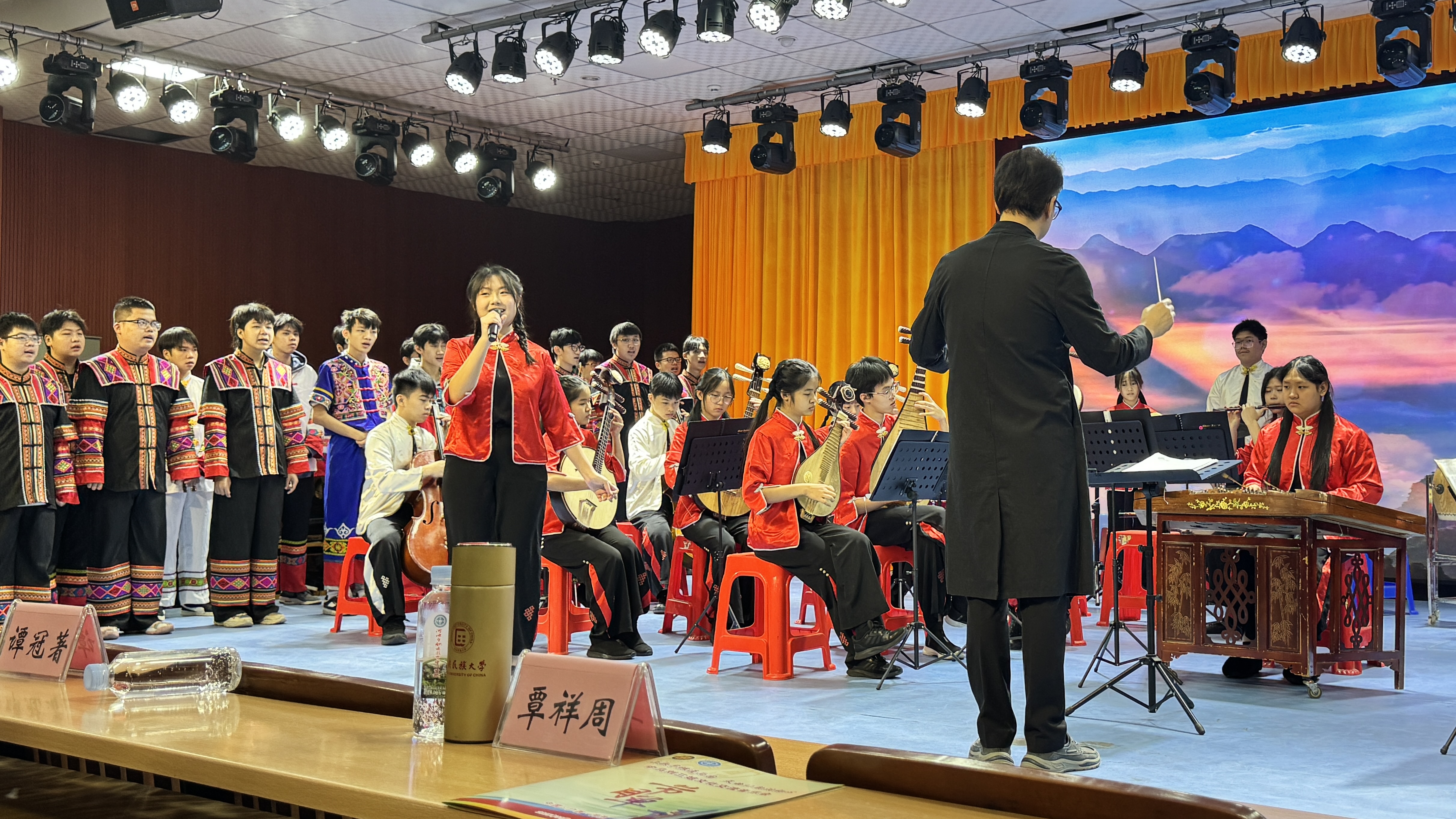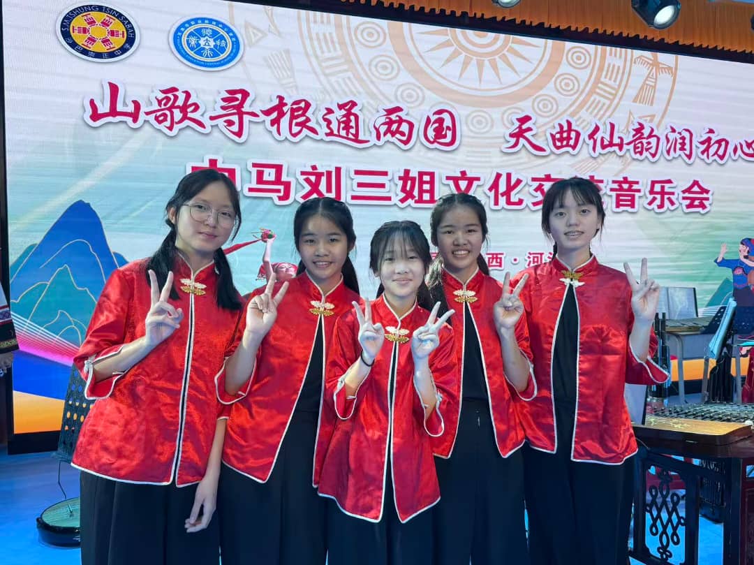 本次交流的核心环节在河池市职业教育中心学校举行。本校华乐团与当地师生携手,在短时间内成功磨合,同台演绎了《刘三姐对歌》、《莲花调》及富有南洋风情的《Rasa Sayang》等多首曲目。在“山歌寻根通两国·天曲仙韵润初心”音乐交流会上,两地学生以华乐与山歌精彩对话,为现场四百余名师生献上了一场视听盛宴。