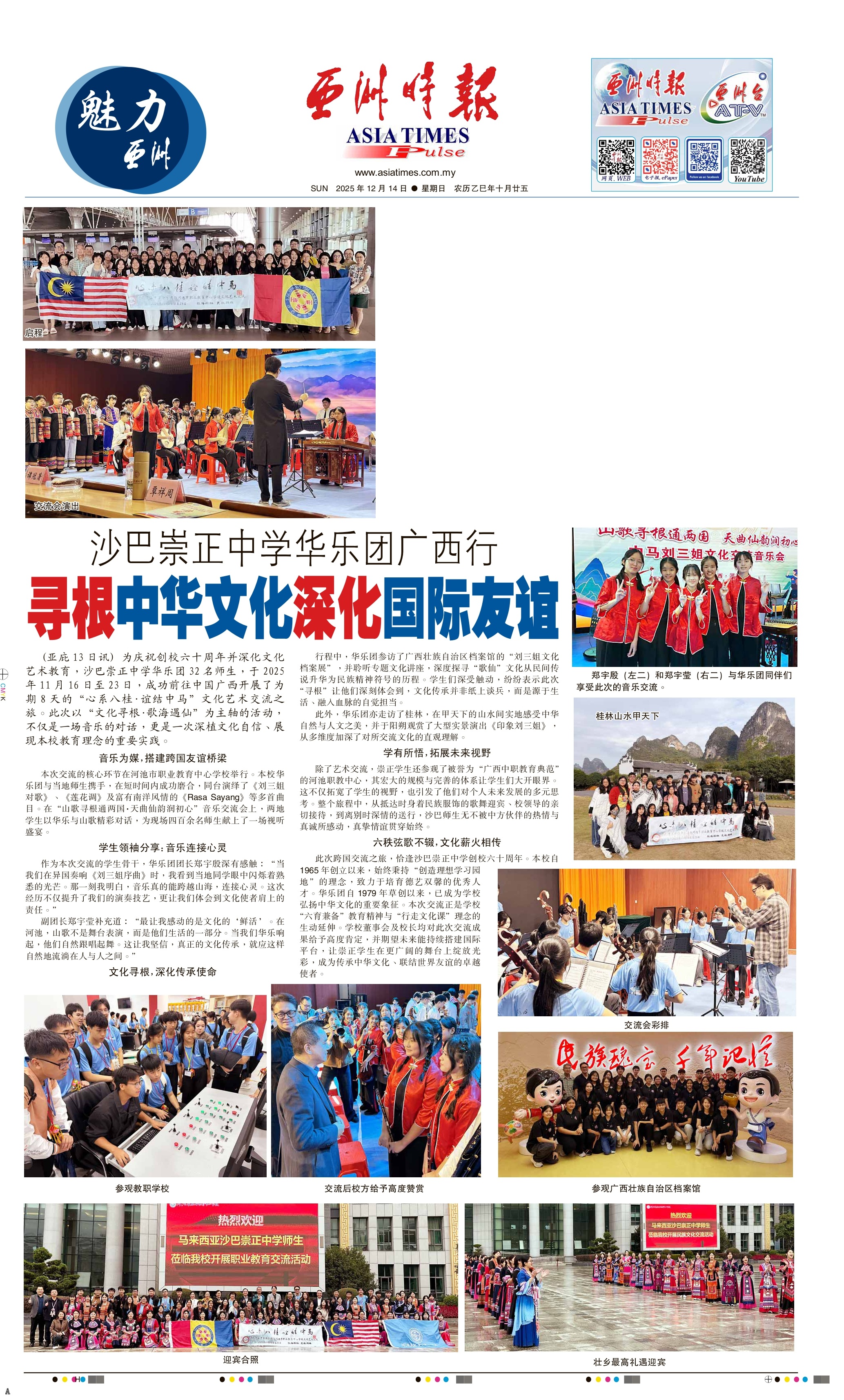为庆祝创校六十周年并深化文化艺术教育,沙巴崇正中学华乐团32名师生,于2025年11月16日至23日,成功前往中国广西开展了为期8天的“心系八桂·谊结中马”文化艺术交流之旅。此次以“文化寻根·歌海遇仙”为主轴的活动,不仅是一场音乐的对话,更是一次深植文化自信、展现本校教育理念的重要实践。