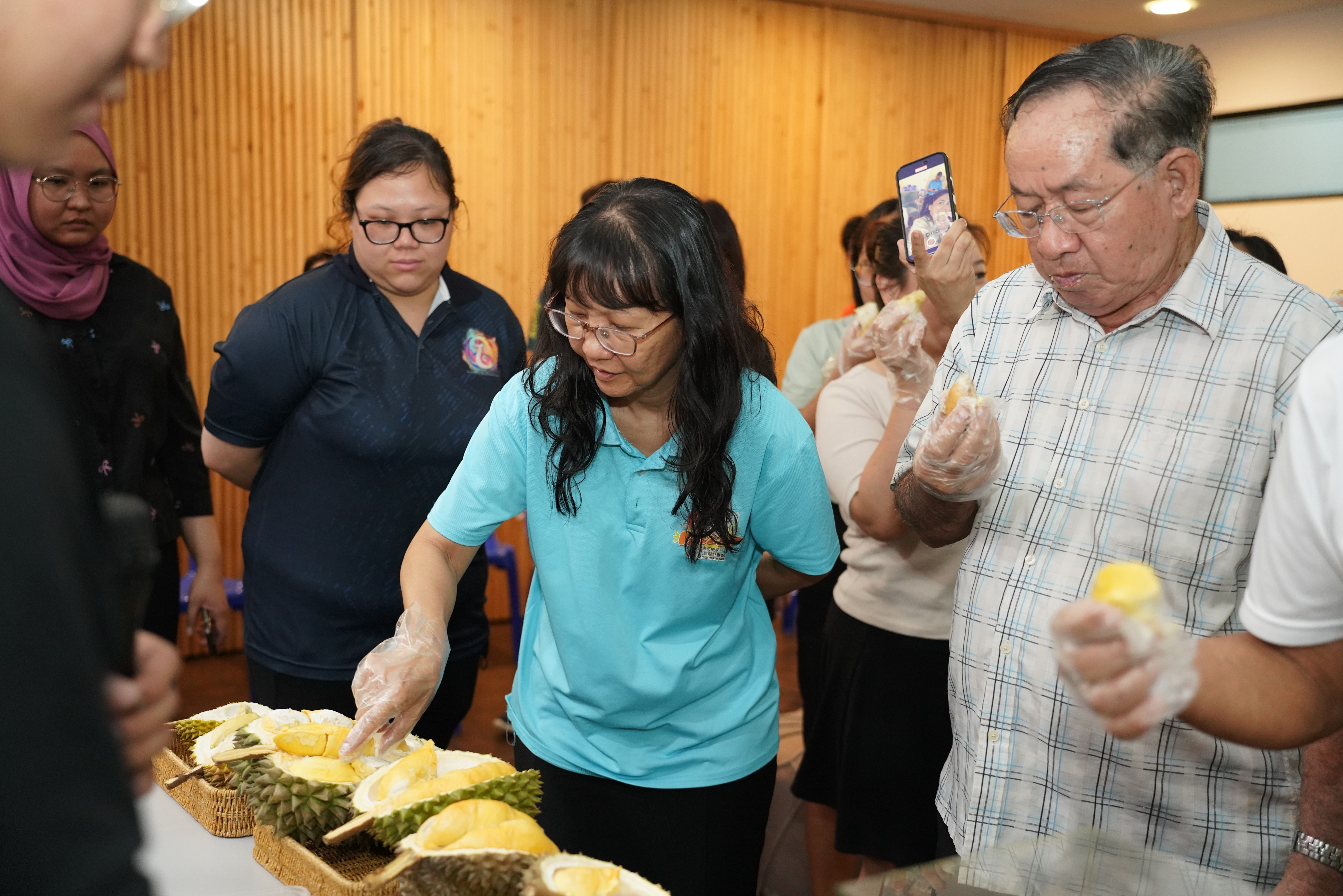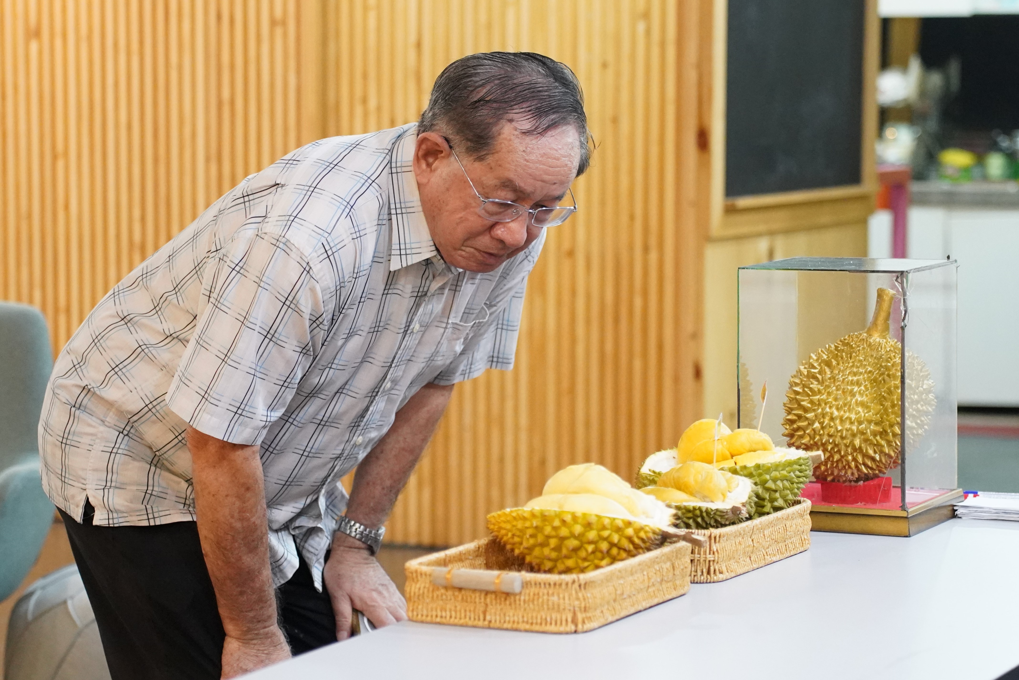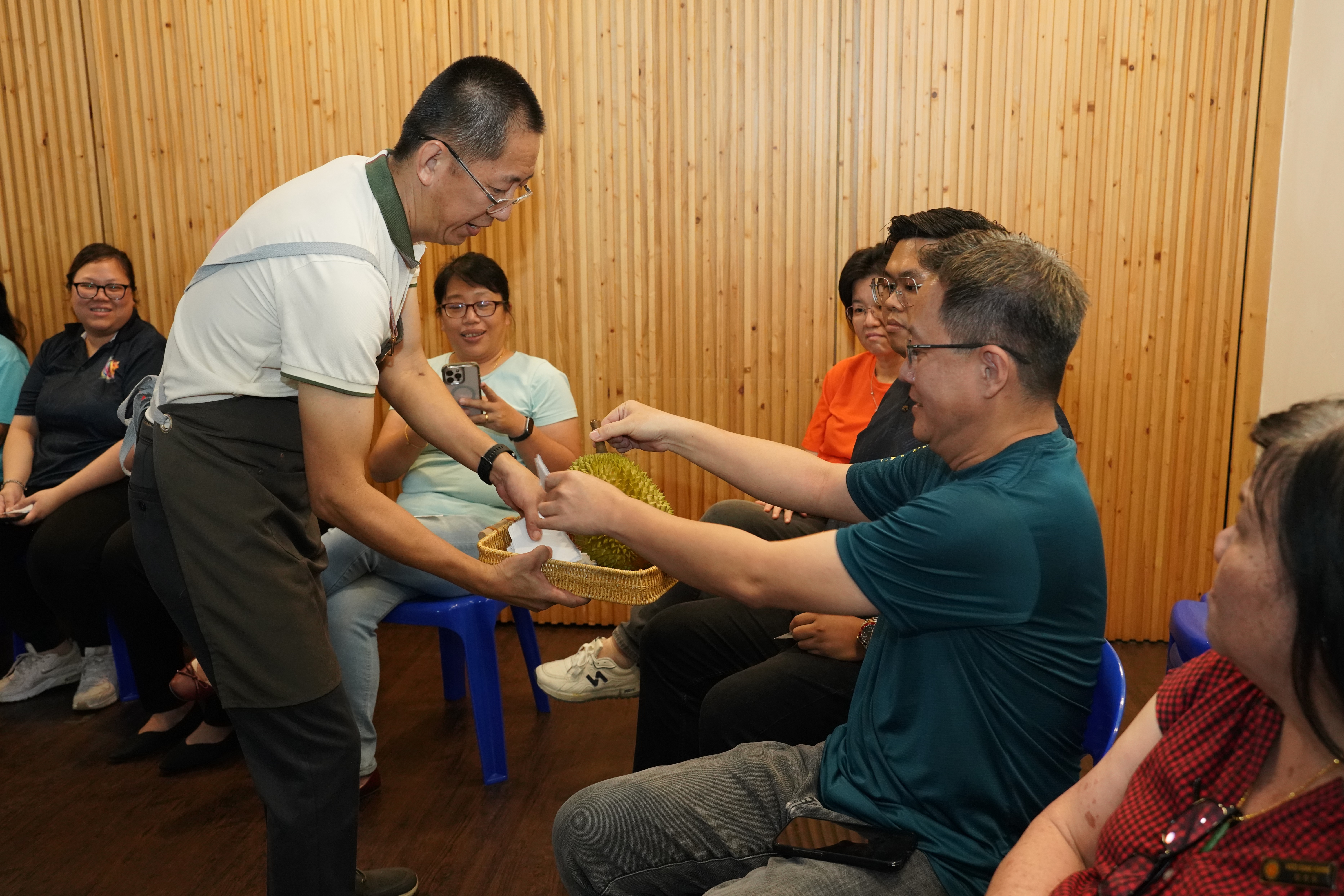 雷光平校友今日特别在学校举办两场榴莲品尝会,向董事、客家公会理事、校友会及教职员介绍榴莲相关知识,并安排大家品尝多种品种的榴莲。