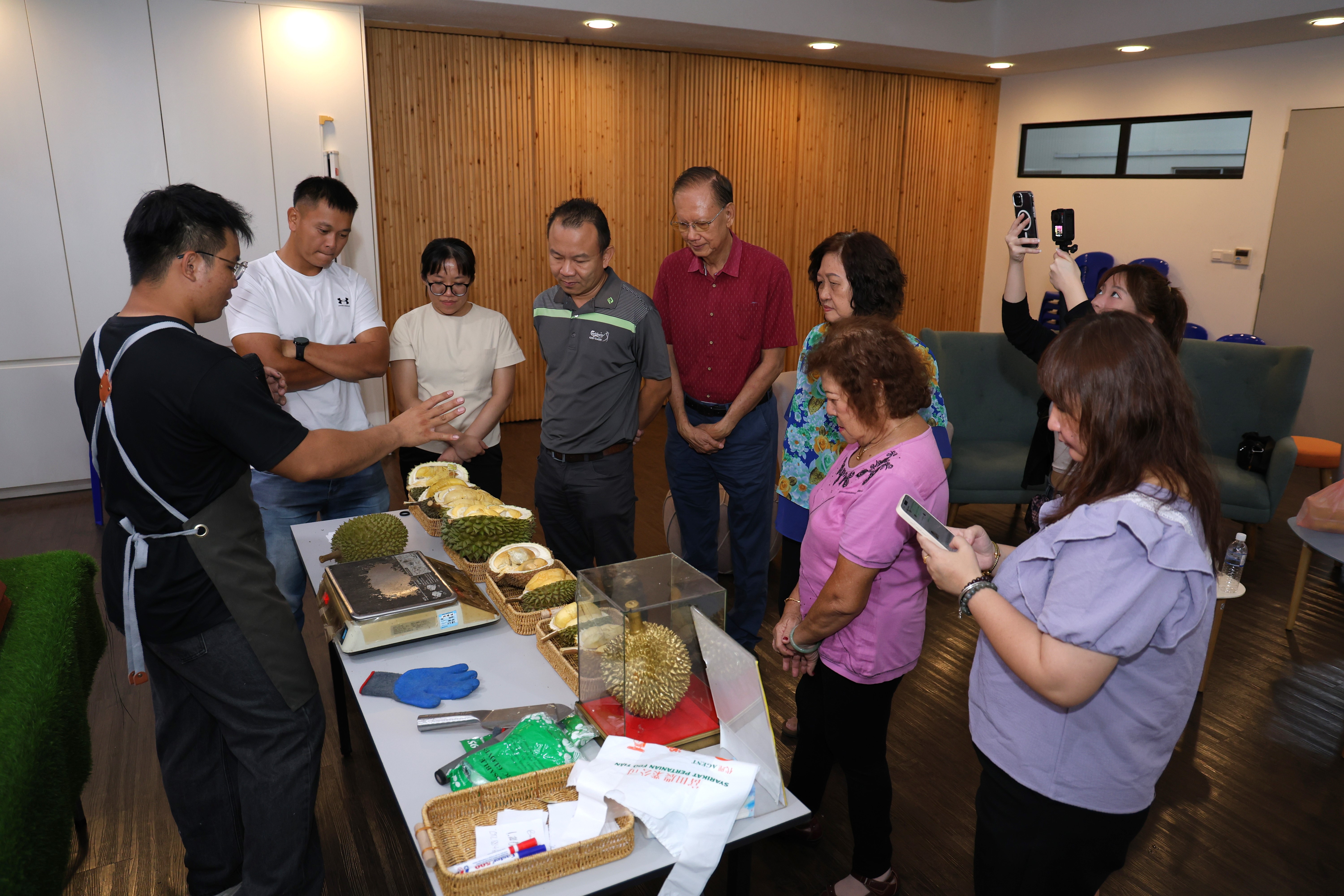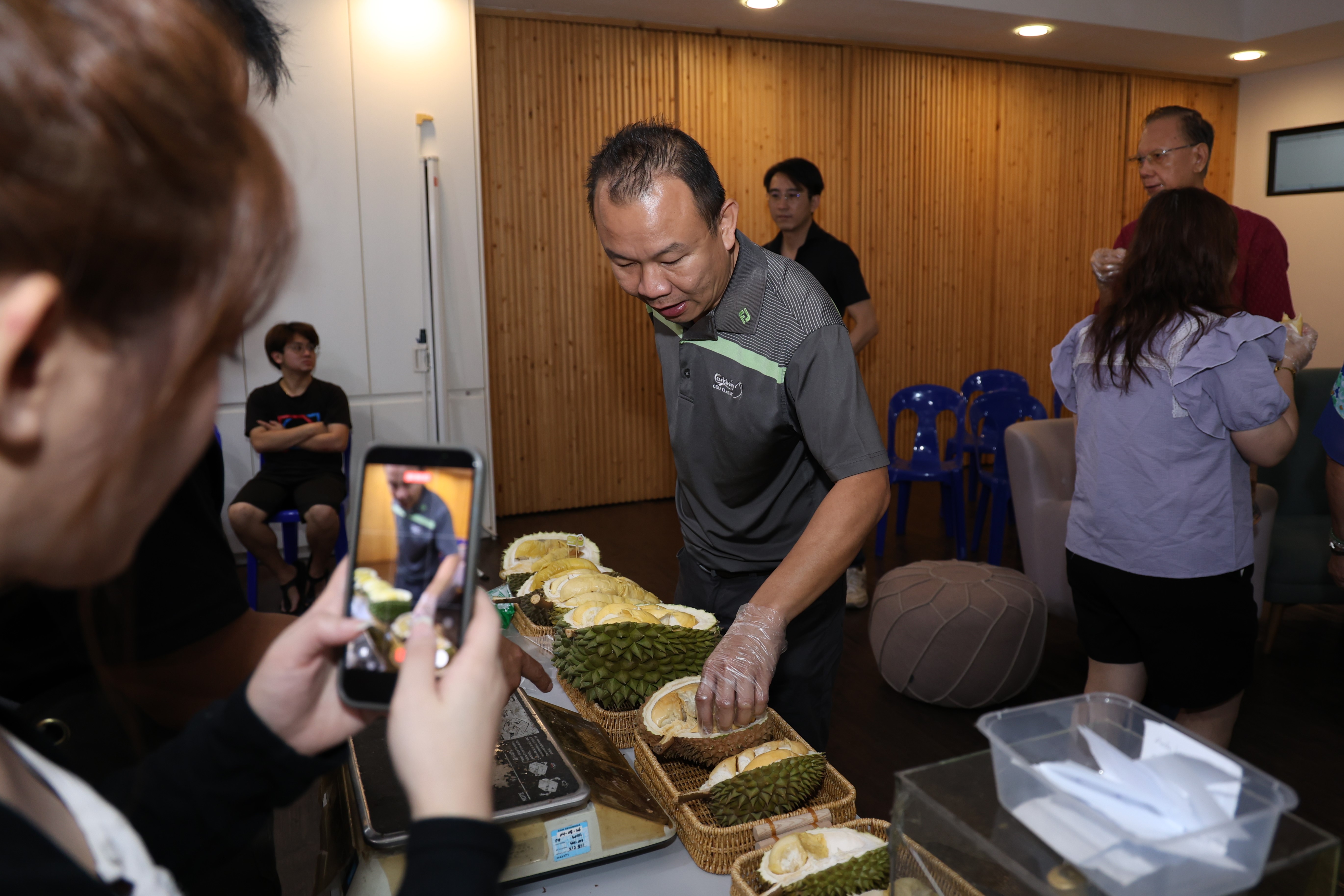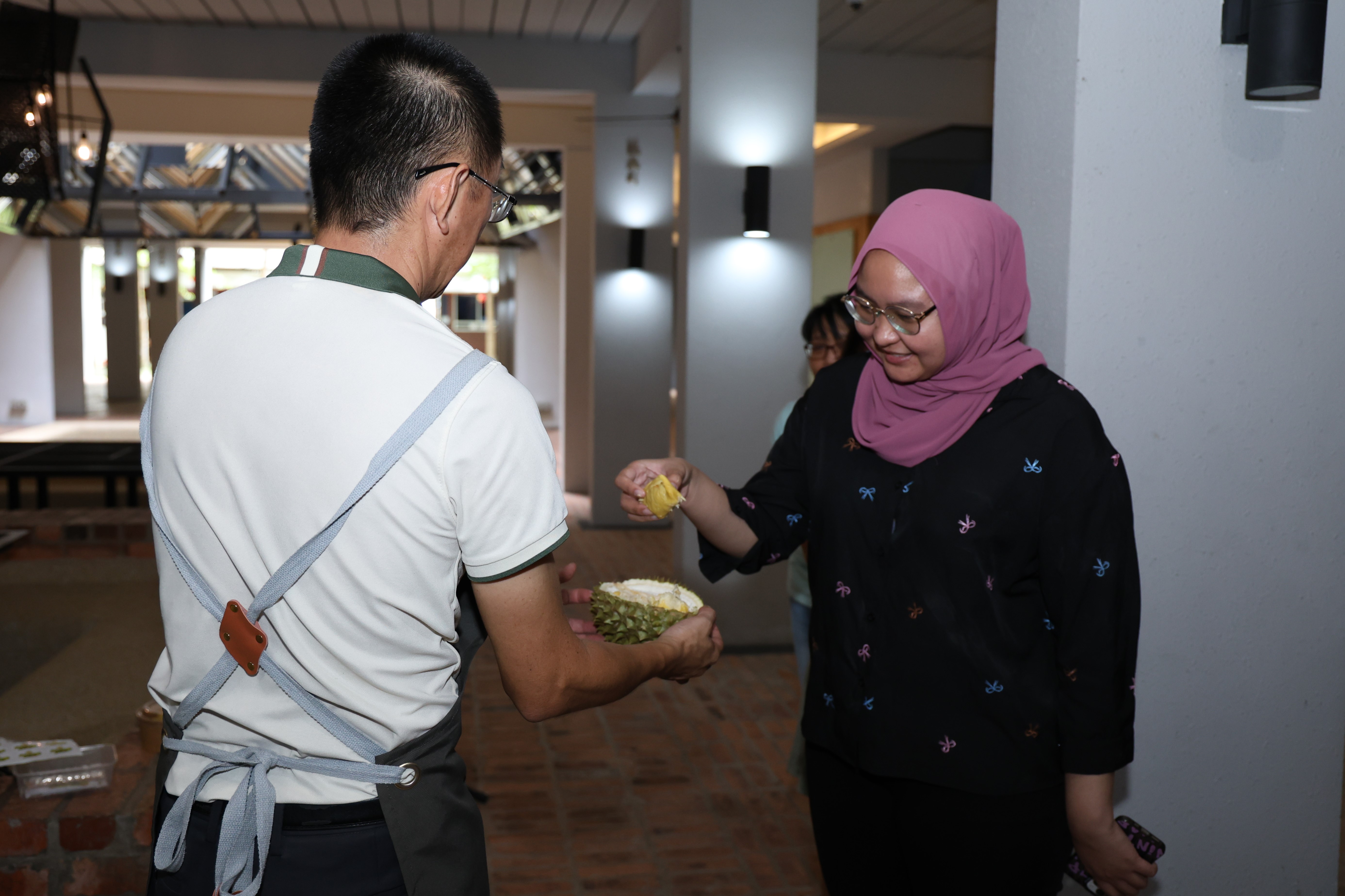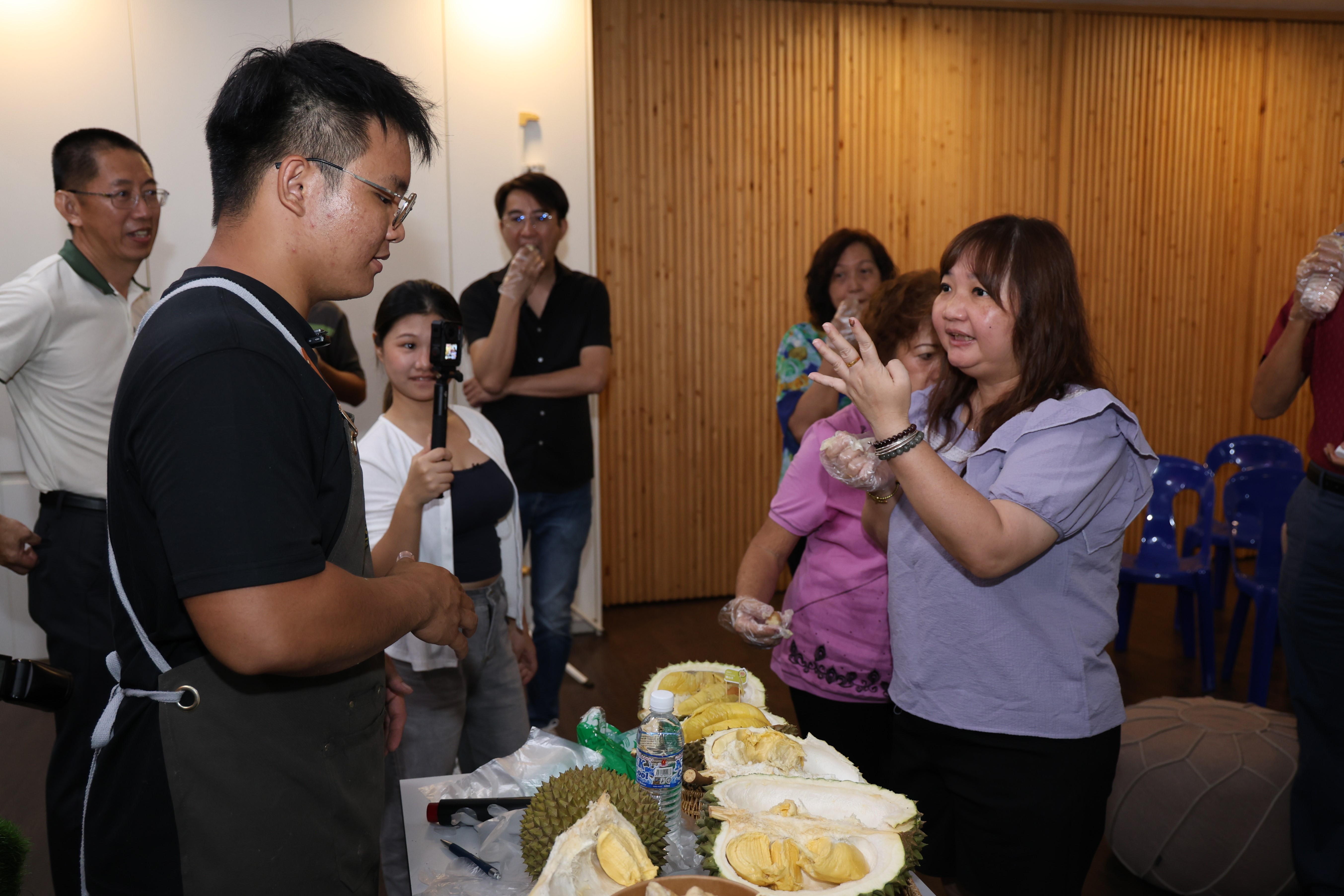 在雷校友以及团队的细心解说和介绍下,大家趁此机会认识不同品种榴莲的口感质地、色泽、香味等特性。这场榴莲工作坊,安排了现学、现看、现吃环节,成为“水果之王”——榴莲的理论与实践机会💪