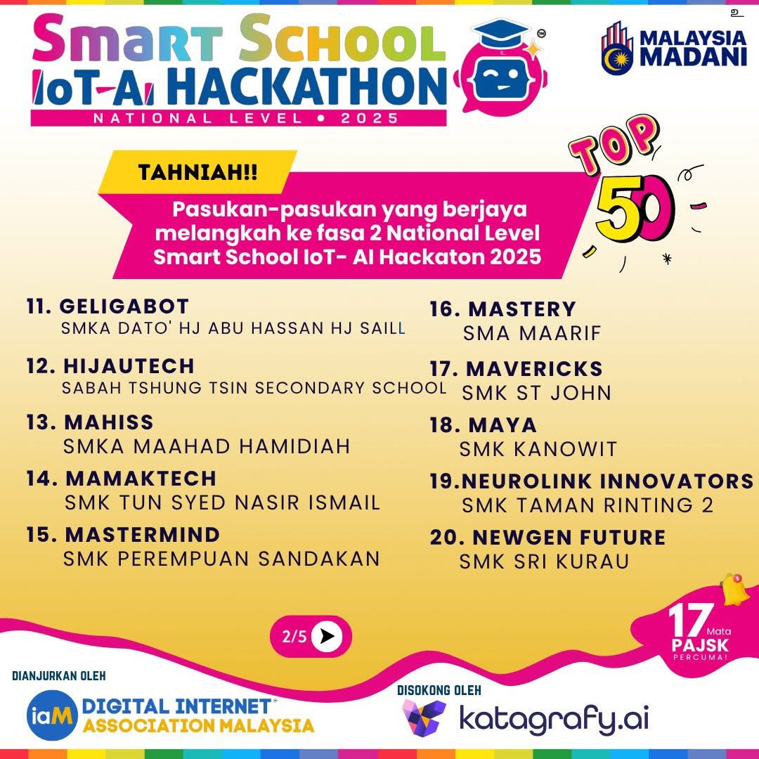 We are proud to announce that our school’s team HijauTech has achieved a remarkable Top 4 position in the National Level Smart School IoT–AI Hackathon 2025!